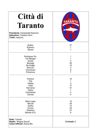 Il documento elenca informazioni sui presidenti, allenatori e le rose delle squadre di calcio in diverse città italiane. Ogni squadra è identificata da dettagli come trofei, stadio e colori ufficiali. Tra i nomi notabili figurano calciatori famosi come Buffon, Cavani e Balotelli.
