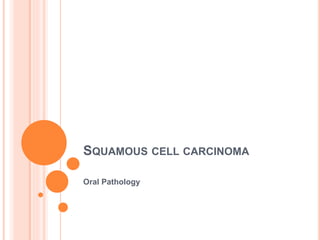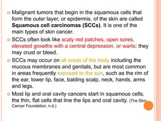 Squamous cell carcinoma (SCC) is a type of skin cancer that develops in squamous cells, which make up the outer layer of the skin. SCCs often appear as scaly red patches or elevated growths and are caused by cumulative lifetime sun exposure. Risk factors include light skin, age, male gender, and sun or chemical exposure. SCCs are most common on sun-exposed areas like the face and neck and are usually treated by removing the lesion, though advanced cases may require surgery, radiation, or chemotherapy. Maintaining good oral hygiene is important for preventing complications from oral SCCs and their treatment.
