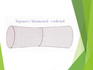 - Square mesh codends can help reduce bycatch compared to traditional diamond mesh codends. Square mesh retains its shape as the codend fills, leaving openings for small fish to escape. Studies show square mesh codends of 55-60mm reduced bycatch by 22-33% and juveniles by up to 95% compared to 100mm diamond mesh.