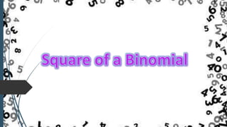 The document discusses how to find the square of a binomial expression using the formula F2 + 2FL + L2, where: - F is the first term of the binomial - L is the last term of the binomial - F2 is the square of the first term - 2FL is twice the product of the first and last terms - L2 is the square of the last term It provides examples of using this formula to find the square of binomial expressions like (x + 2)2, (x - 3)2, (m + 4)2, and (x3 – 2y)2. The key steps are to identify the first and last terms and plug