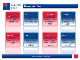 Square One Resources specializes in recruitment across IT sectors, with significant growth in global placements and a diverse candidate pool spanning 40 countries and 20 languages. In 2011, the company saw an increase in overall traffic to their platforms and was preferred by over 32 global companies for placements. Key trends noted include advancements in big data analytics, cloud technologies, and project management methodologies, indicating a strong demand for specialized skills in the evolving tech landscape.