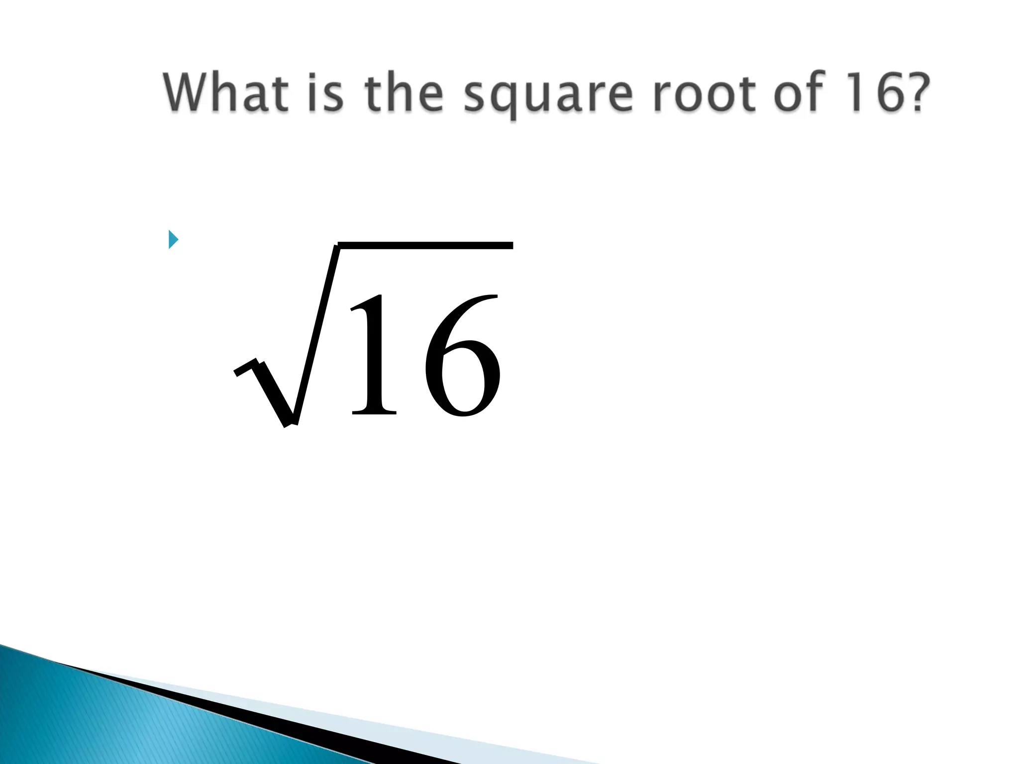 Example of square root with the number 16, where 4 times 4 equals 16.