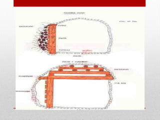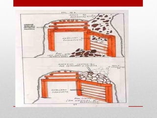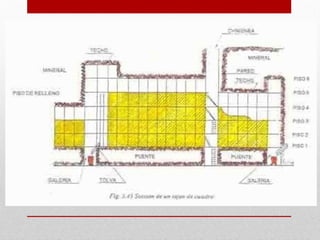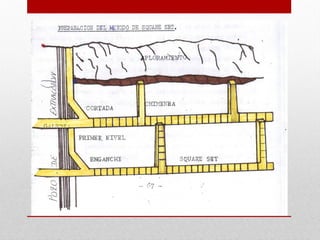 Square-set stoping is an underground mining method that relies on timber frames called "sets" for ground support. It involves removing small blocks of ore and immediately replacing them with pre-built timber sets that are interlocked. The space between the sets is then filled with waste rock or sand. It allows for selective mining of irregular deposits with minimal dilution. However, it has very low productivity and high costs due to the extensive timbering required and is labor intensive. Square-set stoping is best suited for deposits that are too narrow, irregular or unstable for other methods.