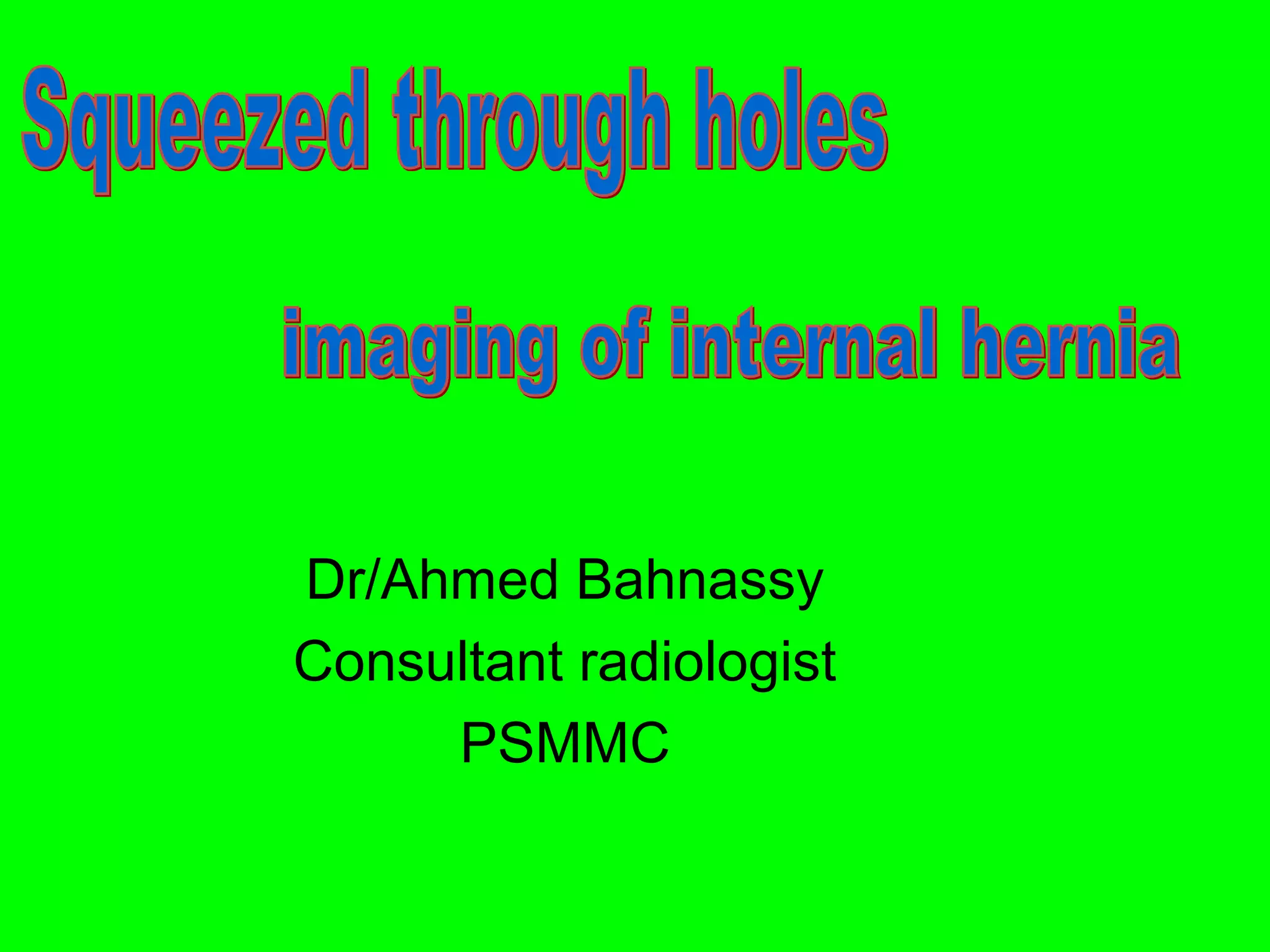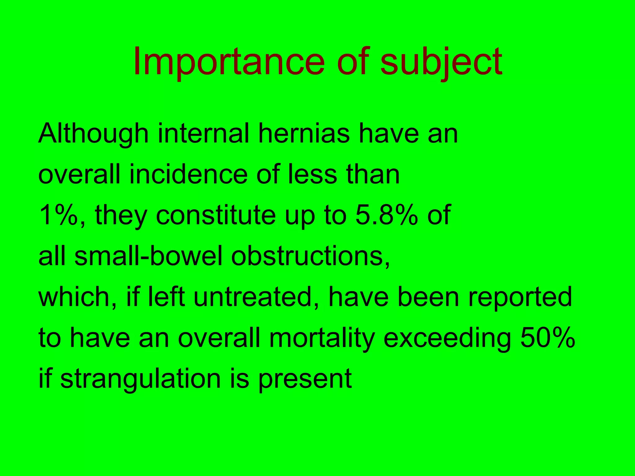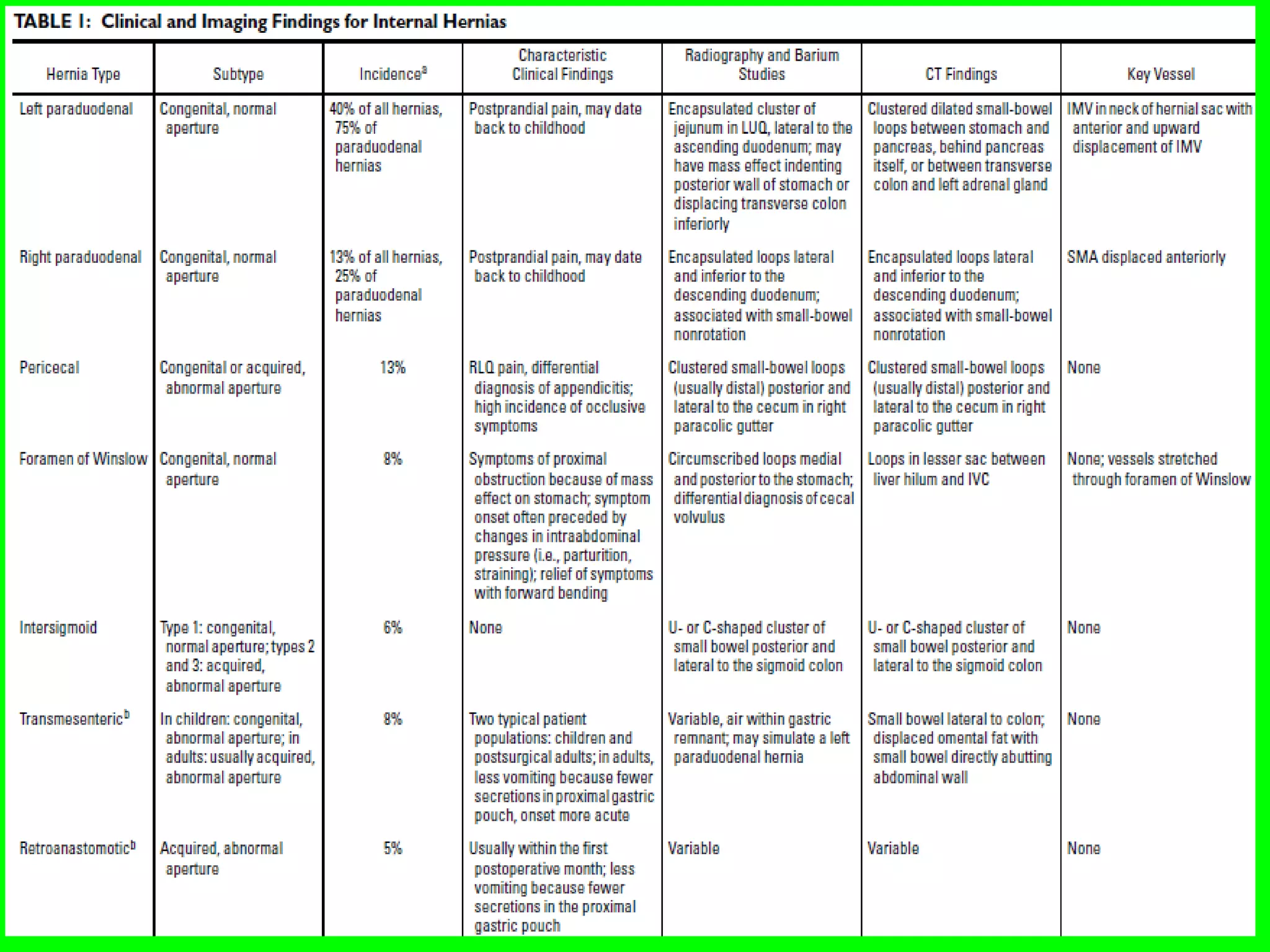 This document discusses internal hernias, which occur when abdominal organs protrude through openings within the abdominal cavity. It describes several types of internal hernias, including paraduodenal, foramen of Winslow, intersigmoid, pericecal, transmesenteric, and retroanastomotic hernias. For each type, it provides details on location, risk factors, and radiographic findings such as clustering of bowel loops and abnormalities of mesenteric vessels. The document emphasizes the importance of recognizing abnormal bowel positioning and configurations, signs of obstruction, and vessel abnormalities on imaging studies to diagnose internal hernias.