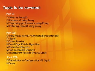 The document discusses proxies and caching. Proxies act as intermediaries between local networks and external networks like the Internet. They can improve performance by caching frequently requested web pages. Squid is an open source proxy caching server that operates by checking its cache for requested objects, retrieving objects from origin servers if needed, and storing cacheable objects in its local cache.