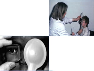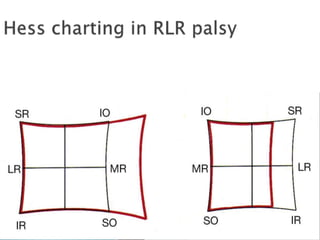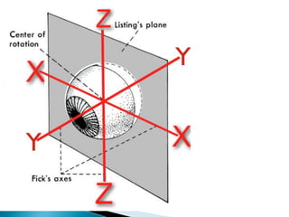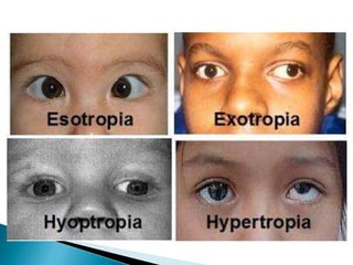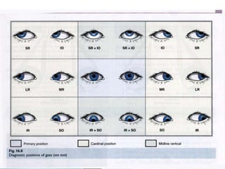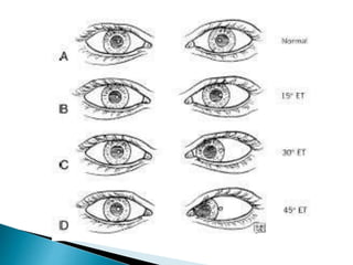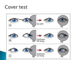 This document summarizes key concepts related to strabismus and eye movement examination. It defines terms like strabismus, visual axis, anatomical axis, orthophoria and describes tests to evaluate eye alignment and movement including:
