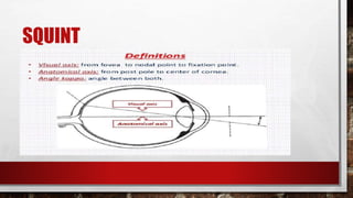 The document discusses squint, also known as strabismus, which is a misalignment of the eyes where the eyes do not point in the same direction. It covers the anatomy of squint including the extraocular muscles that control eye movement and alignment. Tests to assess squint are also mentioned.