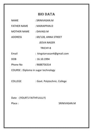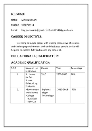 M. Srinivasan is seeking a career opportunity in a creative and challenging environment. He has completed his SSLC in 2009-2010 from St. James Hr. Sec. School in Palakurichy, Trichy with 76% and a Diploma in Sugar Technology from 2010-2013 from Government Polytechnic College Thuvakudi Trichy with 70%. His contact details include his name, father and mother's name, address, email, date of birth, phone number, course and college.