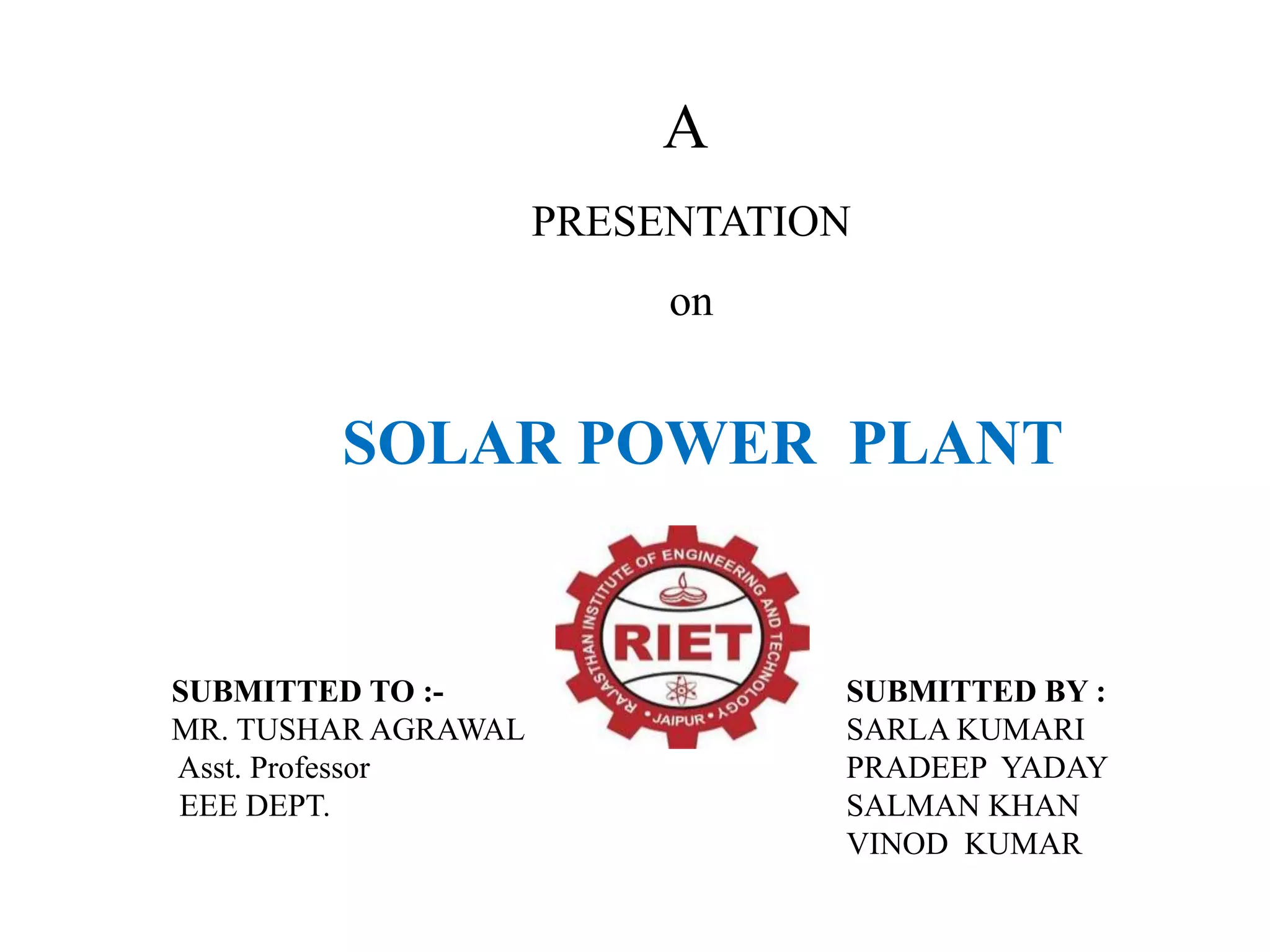 This document presents a solar power plant project that generates 50W of DC power using solar panels and batteries. The solar energy charges a 12V, 7Ah lead-acid battery, which powers a string of 12 high-intensity LEDs acting as street lights. The system includes solar panels that provide 20V of power, a charging circuit to safely charge the battery without overcharging, and an LDR circuit to control the LEDs based on ambient light levels. The goal of the project is to utilize solar energy to provide off-grid street lighting.