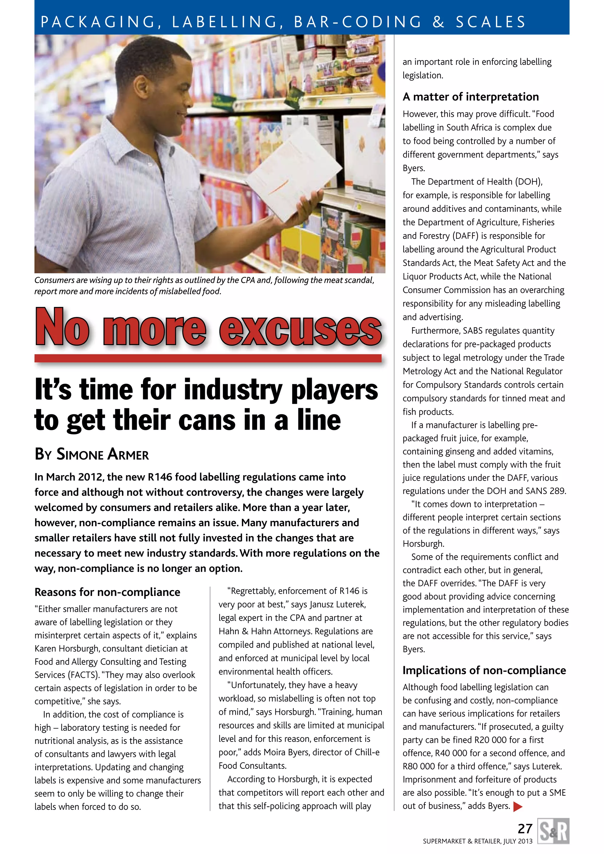 Food labelling in South Africa is regulated by multiple government departments, which can make compliance complex. Updating labels to meet new regulations is expensive for manufacturers. While non-compliance can result in fines, some manufacturers and smaller retailers have yet to fully implement the necessary changes. Consumers are increasingly aware of their rights regarding labelling and instances of reported mislabelled products are growing. Industry players need to make a greater effort to understand and follow all applicable labelling rules.