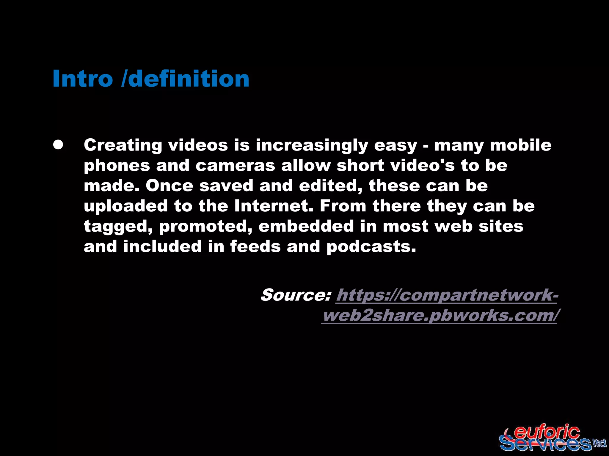 This document discusses using videos for social reporting purposes. It covers key functions videos can support like awareness raising, stakeholder engagement, and capacity building. Examples of video tools that can be used include cameras, movie makers, YouTube, and Blip.tv for recording, editing, uploading, and sharing videos. Guidance is provided on the video process, including converting formats, adding titles and credits, and analytics for monitoring views. Hands-on exercises are suggested to have participants interview each other and upload videos.