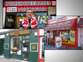 The document discusses multiculturalism in the United Kingdom. It defines multiculturalism and provides population statistics showing immigration trends. Large immigrant populations come from India, Poland, Ireland and Pakistan. While Christianity is still the largest religion, the Muslim population is growing. There is debate around whether multiculturalism has failed in the UK as some argue society needs a stronger national identity to prevent extremism, though others see multiculturalism in major cities.