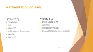 This document is a presentation on RAM that was presented by Tipu Sultan and Md Shakhawat Hossain Sujon to Tafisr Ahmed Khan. It summarizes the key differences between SRAM and DRAM. SRAM does not require refresh cycles but is more expensive and slower than DRAM. A typical SRAM cell uses 6 transistors arranged in two cross-coupled inverters, while a DRAM cell uses one transistor and one capacitor. DRAM must perform periodic refresh cycles to maintain its data due to capacitor leakage, whereas SRAM maintains its data statically without refresh.