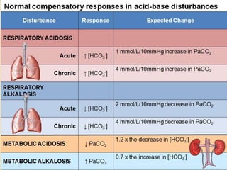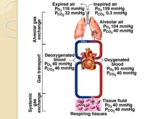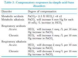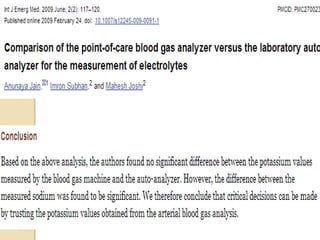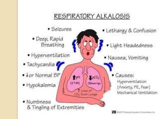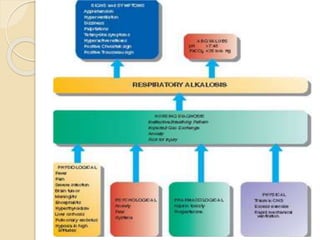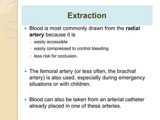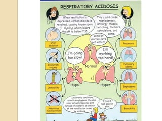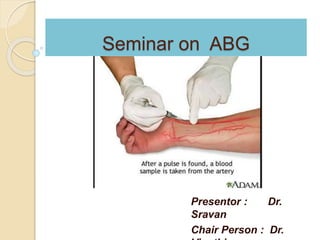 The document summarizes a seminar on arterial blood gases (ABG). Dr. Sravan presented on techniques for blood extraction and parameters analyzed in ABG tests. Key equations relate the partial pressures of oxygen and carbon dioxide to alveolar ventilation and oxygenation processes. Interpreting ABG results involves considering acid-base balance, hypoxemia causes, and the body's normal buffering systems to maintain pH levels. Precise blood drawing and handling is important for accurate ABG analysis.