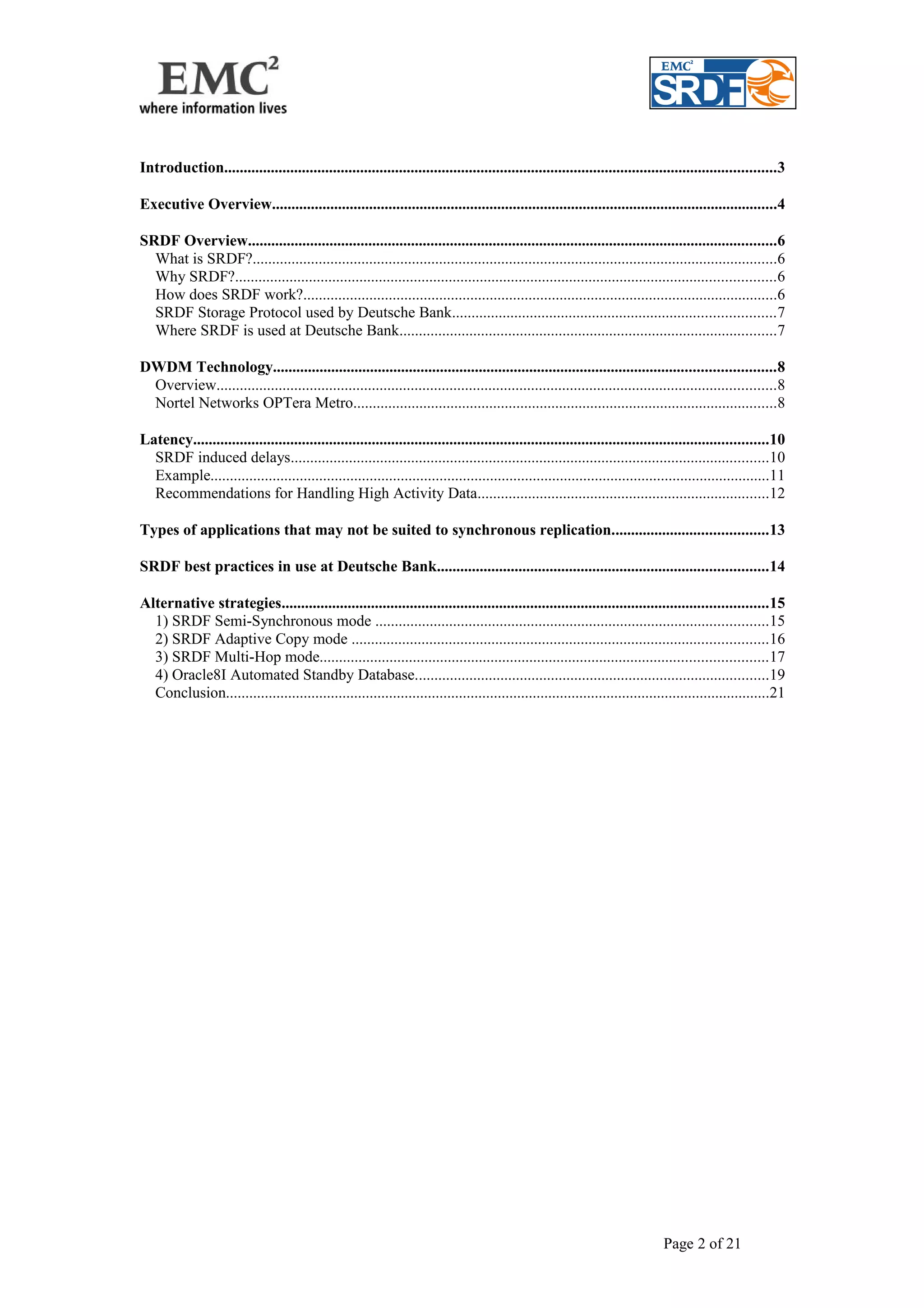 This document discusses using SRDF (Symmetrix Remote Data Facility) with Deutsche Bank to mirror data between storage arrays over long distances using DWDM (Dense Wave Division Multiplexing) technology. It provides an overview of SRDF, how it works, the storage protocols used, and where it is implemented at Deutsche Bank. It also examines the additional latency introduced by synchronously mirroring data over greater distances and provides recommendations and alternative strategies for applications that may not be suited to synchronous replication over an extended distance.