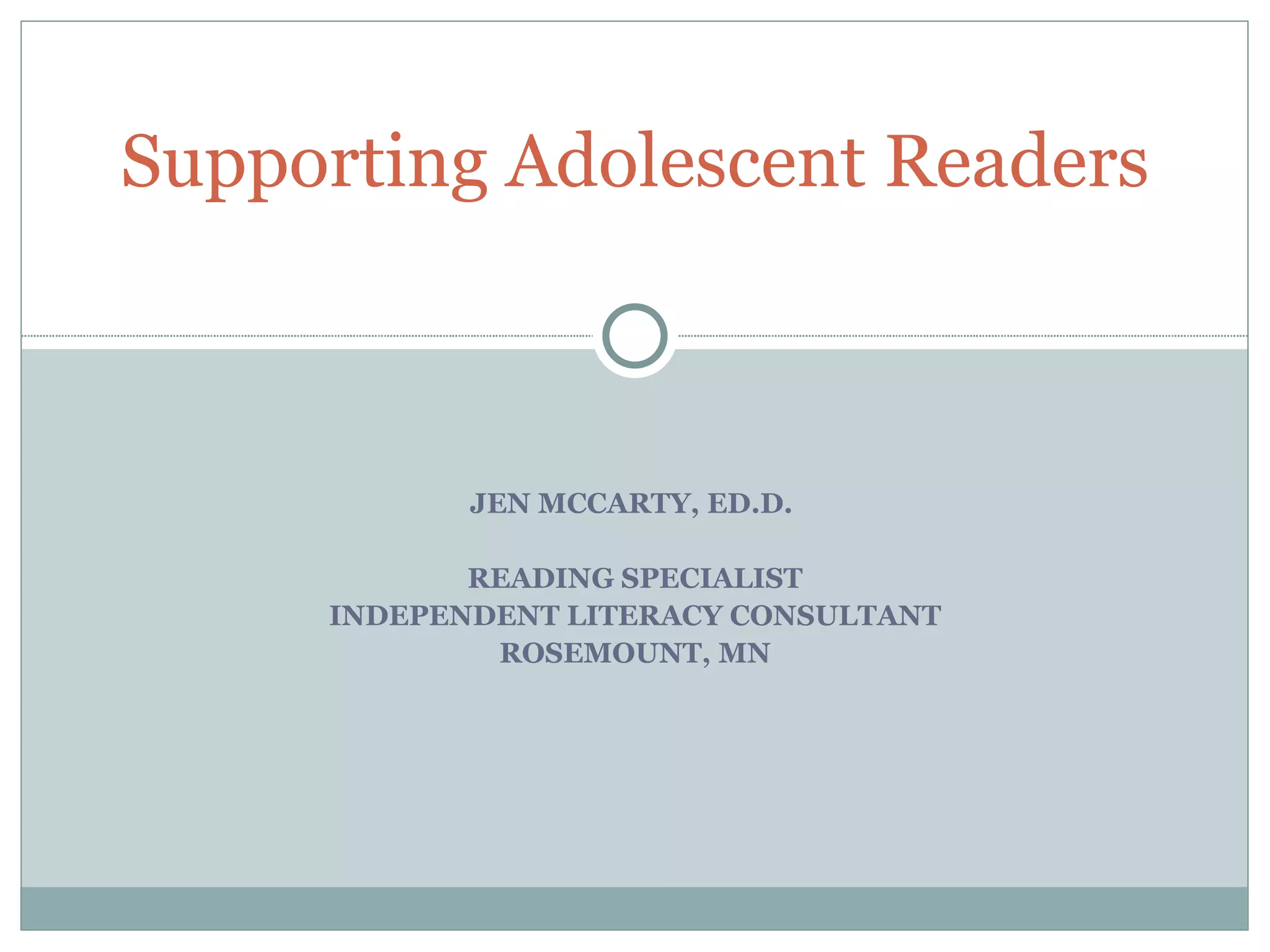 The document discusses the need for strong literacy skills among students given the rapid changes in information and technology. It notes that more information has been produced in the last 30 years than in the previous 5,000, and the amount of information students need to process is growing exponentially. Additionally, having strong literacy skills is important for college admission and career opportunities. The document provides strategies teachers can use to help students improve their reading comprehension, such as using pre-reading activities, annotation strategies, and allowing students to demonstrate their understanding in varied formats.