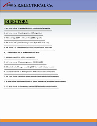 The document describes an inverter based welding machine company called S.R. ELECTRICAL Co. It lists 13 different inverter welding machine models for arc, TIG, and plasma cutting welding. It provides details on the specifications, features, and parameters of some of the machine models including the ARC series inverter DC arc welding machines, WS inverter DC TIG welding machines, and NBC inverter CO2 gas shielded welding machines. The machines listed use IGBT or MOSFET inverter technology and have features like compact design, energy efficiency, and protective circuits for safe operation.