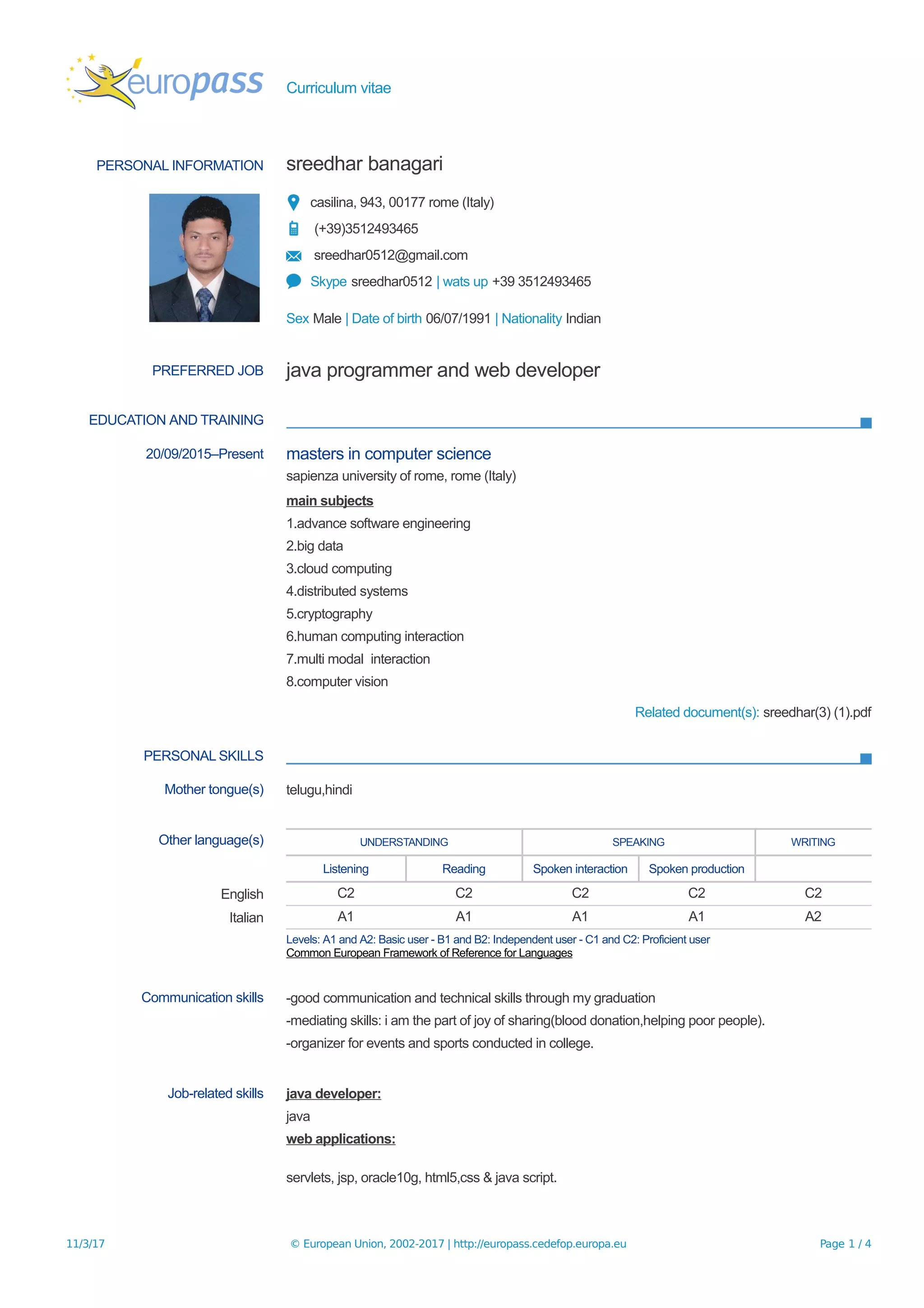 This summary provides an overview of Sreedhar Banagari's curriculum vitae. Sreedhar is currently pursuing a Master's degree in computer science at Sapienza University of Rome, Italy, with a specialization in areas such as software engineering, big data, and cryptography. He has work experience as a Java programmer and web developer. Sreedhar is proficient in English, has good communication skills, and technical skills in areas like Java, web applications, Oracle databases, and Microsoft Office. He is looking for a job as a Java programmer or web developer.