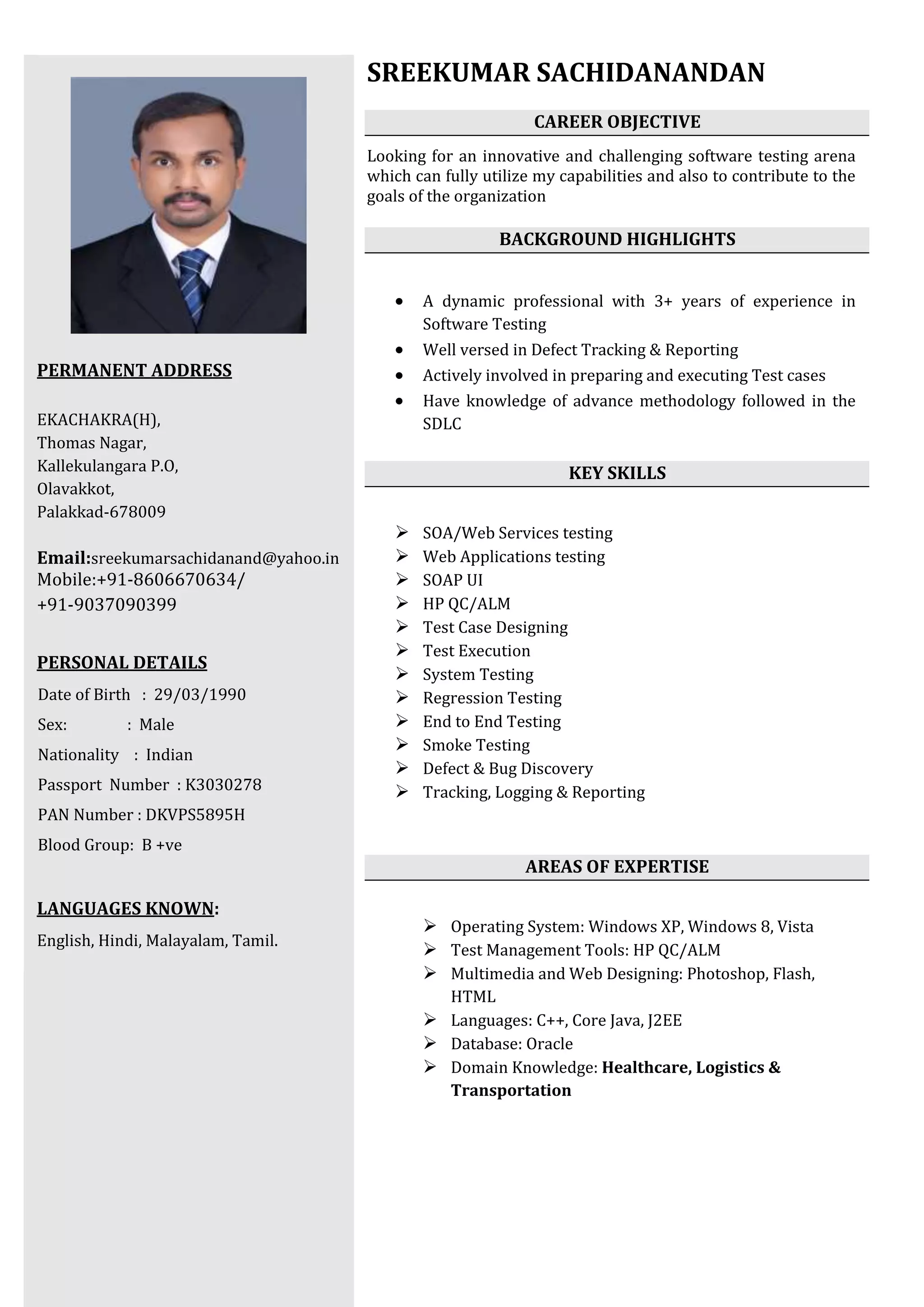 This document contains the resume of Sreekumar Sachidanandan. It includes personal details like name, date of birth, contact information. It outlines his career objective in software testing and highlights 3+ years of experience in areas like test case design, execution, defect tracking and reporting. It also lists technical skills, areas of expertise, educational qualifications and projects undertaken. The document is seeking an innovative role in software testing that can utilize his capabilities.