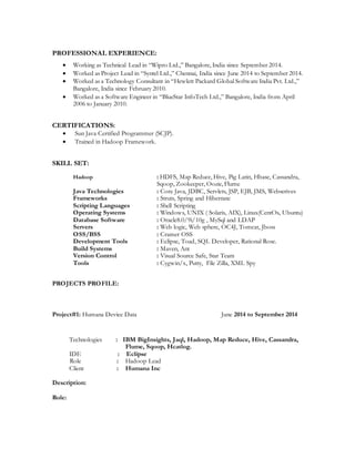 The document contains a profile summary for B. Sreenivasula Reddy including his contact information, 8.5 years of experience in Java and big data technologies, expertise in Hadoop ecosystem tools, databases like HBase and MongoDB, and frameworks like Spring. It also lists his educational qualifications and provides details of projects he has worked on involving technologies like Hadoop, Hive, Pig and frameworks like Java EE.