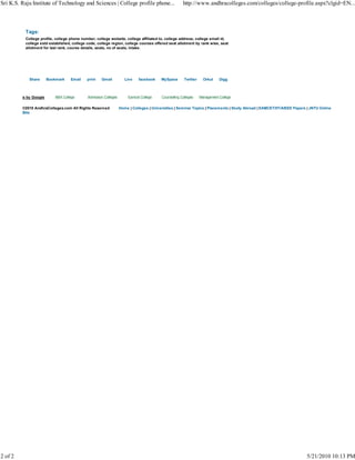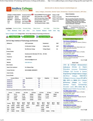 Sri K.S. Raju Institute of Technology and Sciences, established in 2007 and affiliated with JNTU Hyderabad, is a co-educational college located in Kanakamamidi, Moinabad, offering various engineering and pharmacy courses. The college provides contact details and additional information about admissions, scholarships, and course offerings including seat allotment results. The document contains links to external educational resources and a summary of available college programs and credentials.