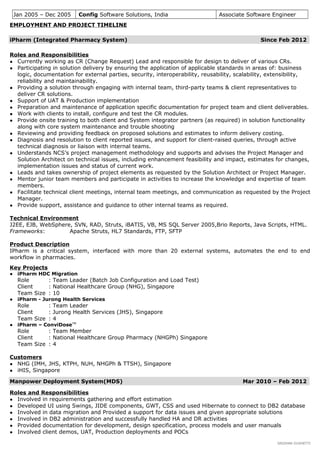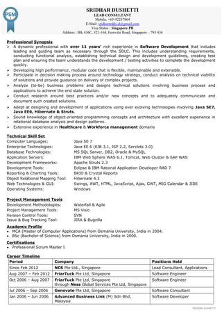 Sridhar Duchetti is a lead consultant with over 11 years of experience in software development using technologies like Java, Struts, Hibernate, and databases like SQL Server, Oracle, and MySQL. He has extensive experience leading teams on projects in healthcare and workforce management domains for clients in Singapore, Malaysia, and India. His roles include requirements gathering, design, development, testing, deployment, support, and providing guidance to junior team members.