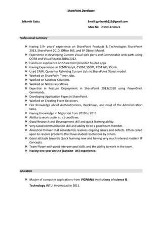 Srikanth Gattu is a senior software engineer with over 3.9 years of experience developing custom solutions for SharePoint 2013, 2010, and Office 365. He has extensive experience developing web parts, workflows, and automating processes using tools like Nintex. He is proficient in C#, JavaScript, AngularJS, jQuery and the SharePoint object model.