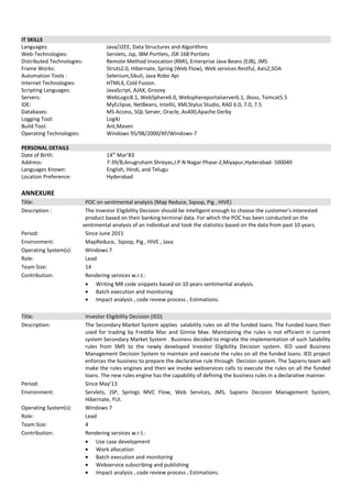 This document is a resume for Srikanth Challapalli summarizing his experience and qualifications. He has over 9 years of experience in software development and project management using technologies like Java/J2EE, Hibernate, Spring, and web services. He is seeking a mid-senior level role in software engineering at a reputable tech or banking company. His experience includes several projects in roles such as lead developer and technical specialist at companies including Wells Fargo and JPMorgan Chase.