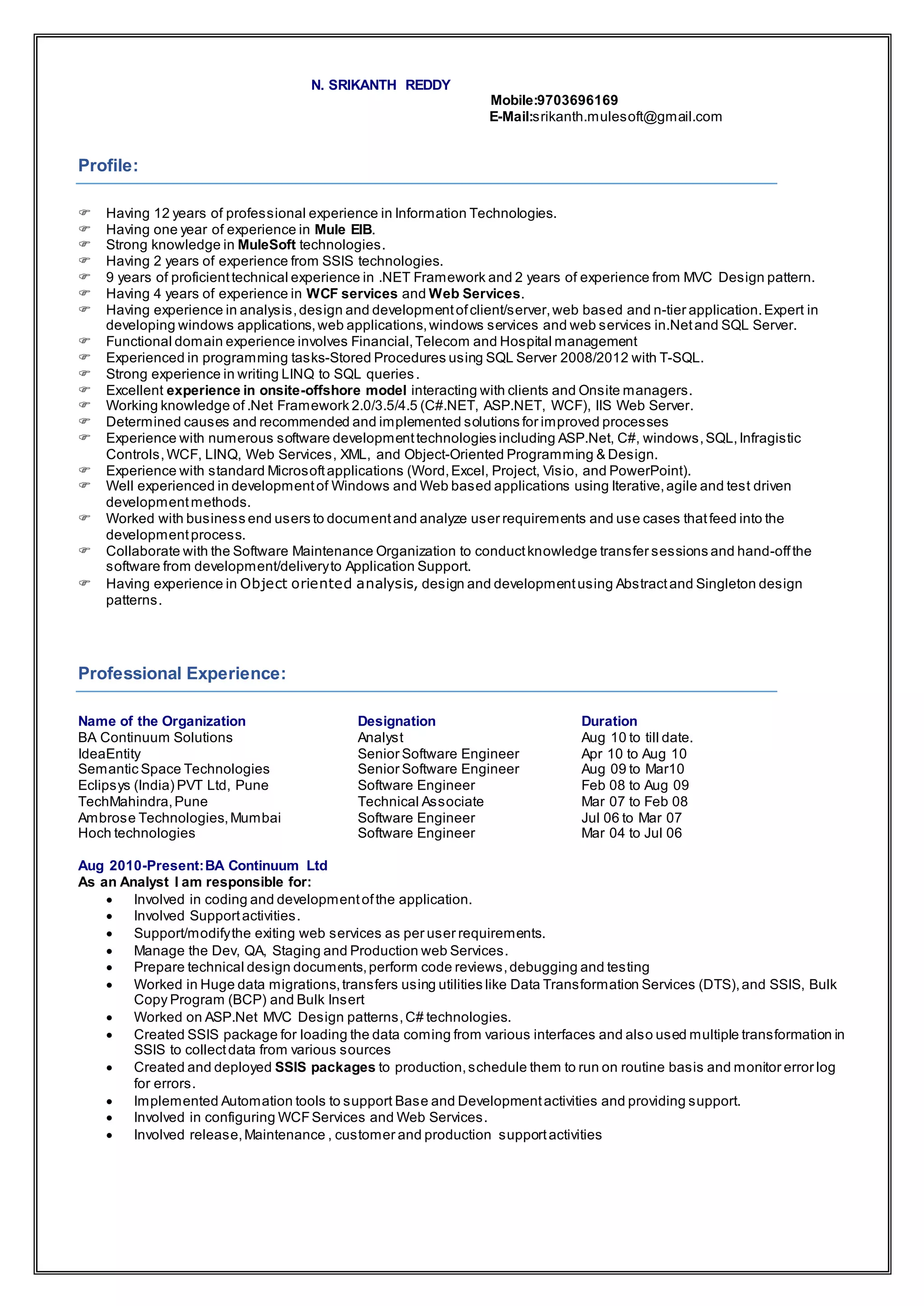 This document contains a profile summary for N. SRIKANTH REDDY. It includes his contact information, 12 years of experience in information technologies including 1 year with Mule EIB, and skills in .NET, SQL Server, C#, ASP.NET, WCF, XML, and SSIS. It also lists his professional experience with various companies as a software engineer and analyst from 2004 to the present, and education including a Master's degree in Computers.