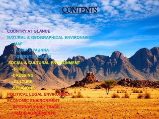Sri Lanka is an island country located off the southeast coast of India. It has a population of over 21 million people and its capital and largest city is Colombo. The main ethnic groups are Sinhalese, Sri Lankan Tamil, Moors, and Indian Tamil. Buddhism is the largest religion. Sri Lanka has a developing economy based around agriculture, fishing, and tourism. It has close economic and political ties to India and China. The presentation provided an overview of Sri Lanka's geography, culture, politics, economy and trade relationships.