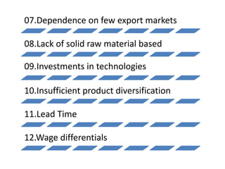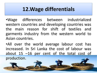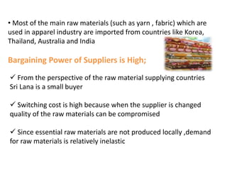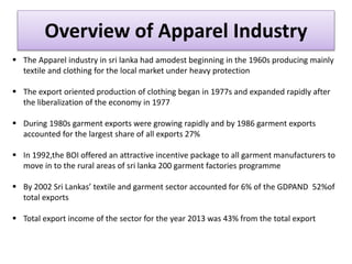 The textile and apparel industry is the largest export industry and foreign exchange earner in Sri Lanka. It began modestly in the 1950s and grew significantly with economic liberalization policies in the 1970s and partnerships with international brands in the 1980s. The industry produces a wide range of clothing for major international brands. While it faces challenges from competitors and issues retaining its GSP+ status, the government is working to increase the industry's global market share through trade agreements and improving technology, branding, and support for small and medium enterprises.