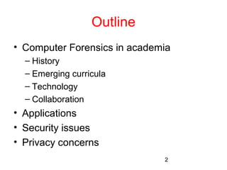 This document discusses security and privacy concerns regarding computer forensics applications. It provides an overview of the history and development of computer forensics as a field, both in law enforcement and academia. It also outlines common computer forensics techniques and tools, emerging curricula in university programs, and important considerations regarding privacy and security of digital evidence.