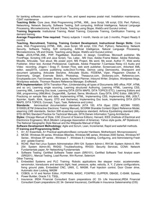 The document provides a curriculum vitae for Mr. Sriram with contact information, objective, summary of qualifications, and detailed work experience and skills in areas such as technical writing, teaching, software testing, and product support. He has over 20 years of experience in fields including IT education, banking, ERP systems, and internet security. The CV lists various technical skills, software tools, and methodologies that could be applicable to roles in technical documentation, learning and development, or product management.