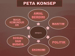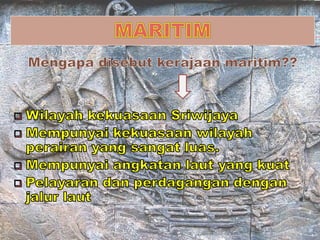 Kerajaan Sriwijaya dikenal sebagai kerajaan maritim pertama di Asia Tenggara yang berdiri pada abad ke-7 di Sumatera Selatan. Sriwijaya menjadi pusat perdagangan, agama Buddha, dan pendidikan. Beberapa raja terkenalnya antara lain Dapunta Hyang Sri Jayanagara dan Dharmasetu. Sriwijaya mulai melemah akibat serangan dari kerajaan lain dan berkurangnya aktivitas perdagangan.