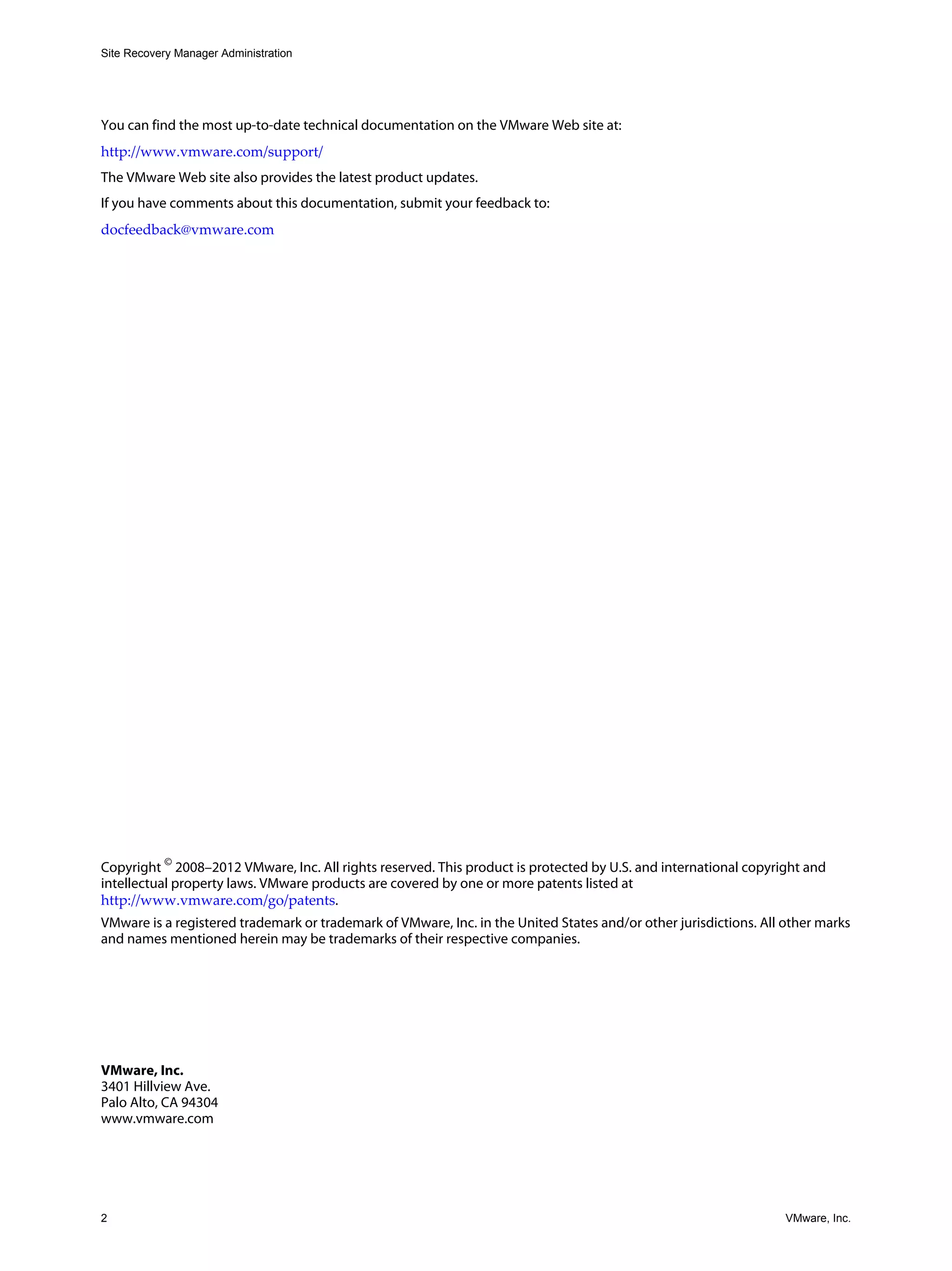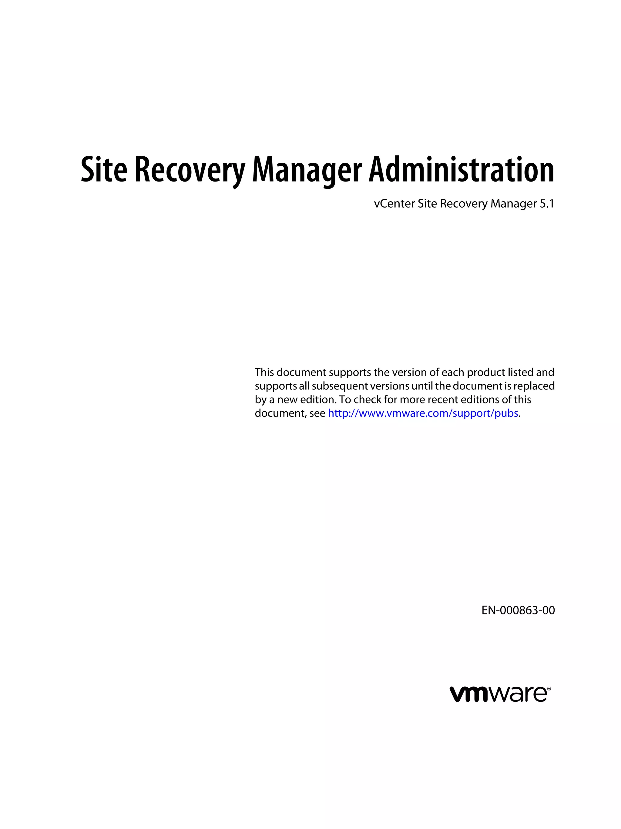 This document provides guidance for administrators on configuring and using VMware vCenter Site Recovery Manager (SRM). SRM allows administrators to plan, test, and execute disaster recovery of VMs managed by vCenter Server. The document covers topics such as assigning privileges and permissions in SRM, creating protection groups for VMs, developing and testing recovery plans, customizing IP and networking settings during recovery, and troubleshooting SRM operations.
