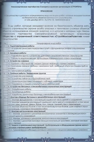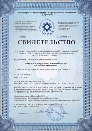 Документ подтверждает допуск общества с ограниченной ответственностью 'строймонтажразвитие' к выполнению работ, влияющих на безопасность объектов капитального строительства, с указанными видами работ. Свидетельство выдано 22 декабря 2015 года саморегулируемой организацией 'строитель', без ограничения срока и территории действия. Оно заменяет предыдущее свидетельство и предоставляет полные права на выполнение строительных, монтажных и пуско-наладочных работ.