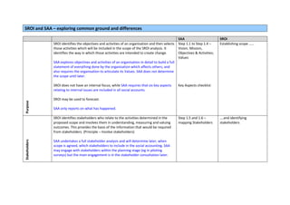 The document compares Social Return on Investment (SROI) and Social Accounting and Audit (SAA), which are both approaches to understanding and accounting for social impact. While they have many similarities in principles and methods, some key differences are that SROI focuses on outcomes and financial valuation, while SAA requires reporting on internal issues and outputs. SROI can be used to forecast impact, while SAA reports on past performance. SROI involves stakeholders primarily in defining outcomes, while SAA engages stakeholders more broadly. SROI calculates ratios and estimates factors like deadweight, while SAA demonstrates but does not necessarily measure impact. Both aim for transparency through reporting and assurance of reports.