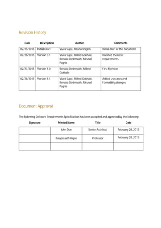 The document is a software requirements specification (SRS) for the Aloha social network. It describes the purpose, scope, definitions, intended audience, and overview of the document. It then provides an overall description of the product including its perspective, functions, operating environment, user characteristics, constraints, assumptions, and apportioning of requirements. The document outlines specific requirements including external interfaces, functional requirements grouped into user registration/profile, friends/suggestions, posts/shares, and chat. It also includes use cases, non-functional requirements, and a requirement traceability matrix. The document describes the change control mechanism for documenting, assessing, designing/testing, and final assessment of changes.