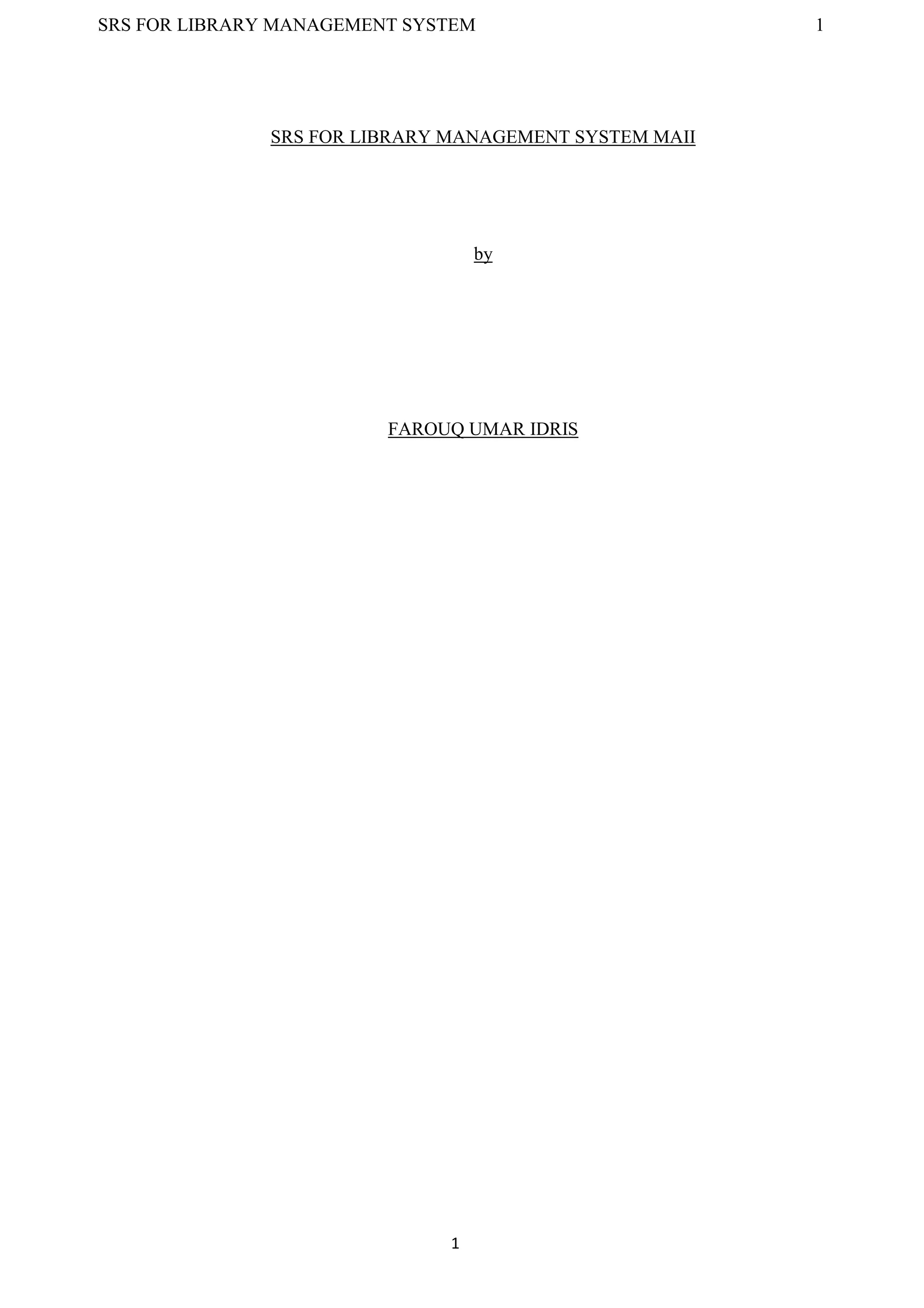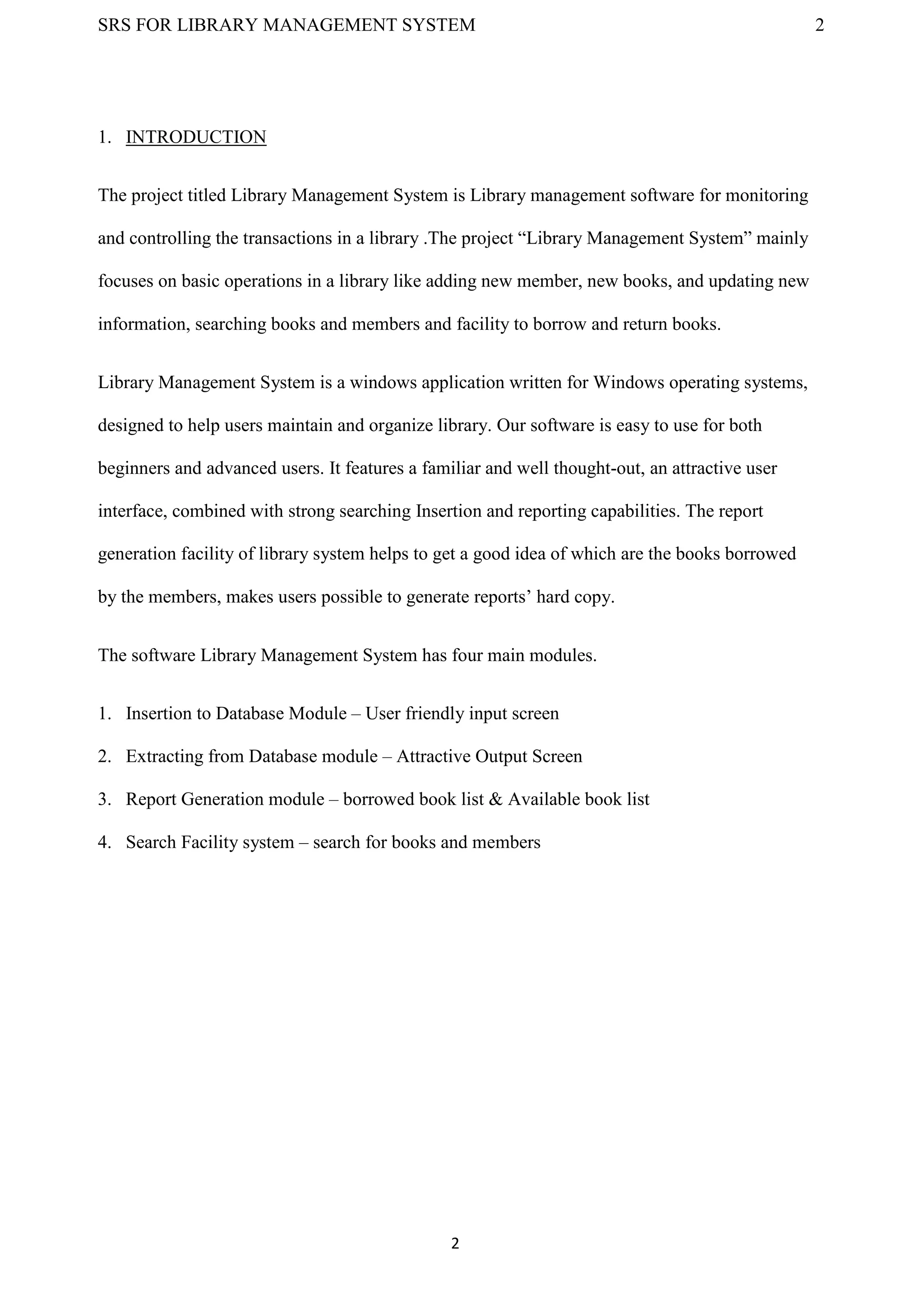 This document provides a software requirements specification (SRS) for a library management system. It describes the existing manual system, proposed automated system, system requirements, and key system features. The proposed system will automate library operations like adding books and members, searching, borrowing and returning books, and generating reports. It aims to make transactions faster and reduce errors compared to the existing manual process. The SRS outlines user interface designs, database tables, and an implementation plan for training users and transitioning to the new system.