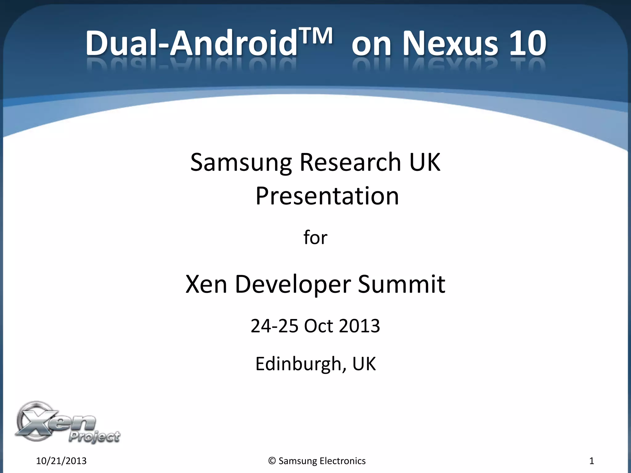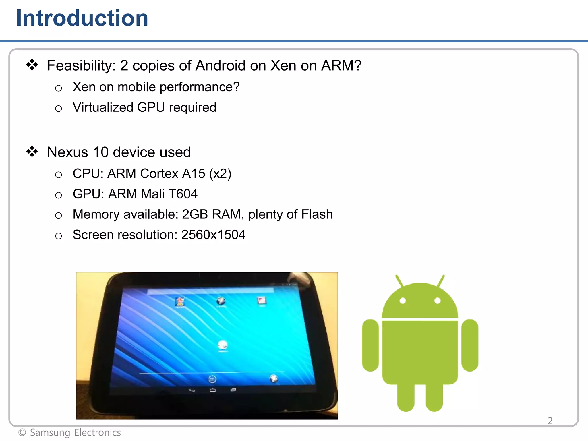 The presentation discusses the feasibility of running two copies of Android on a Nexus 10 device using Xen virtualization on ARM architecture. Key points include performance challenges related to virtualized graphics and I/O device management, as well as successful demonstrations of near-native performance in concurrent Android environments. The conclusion highlights that dual Android instances can operate effectively on mobile devices without significant modifications to the Xen architecture.
