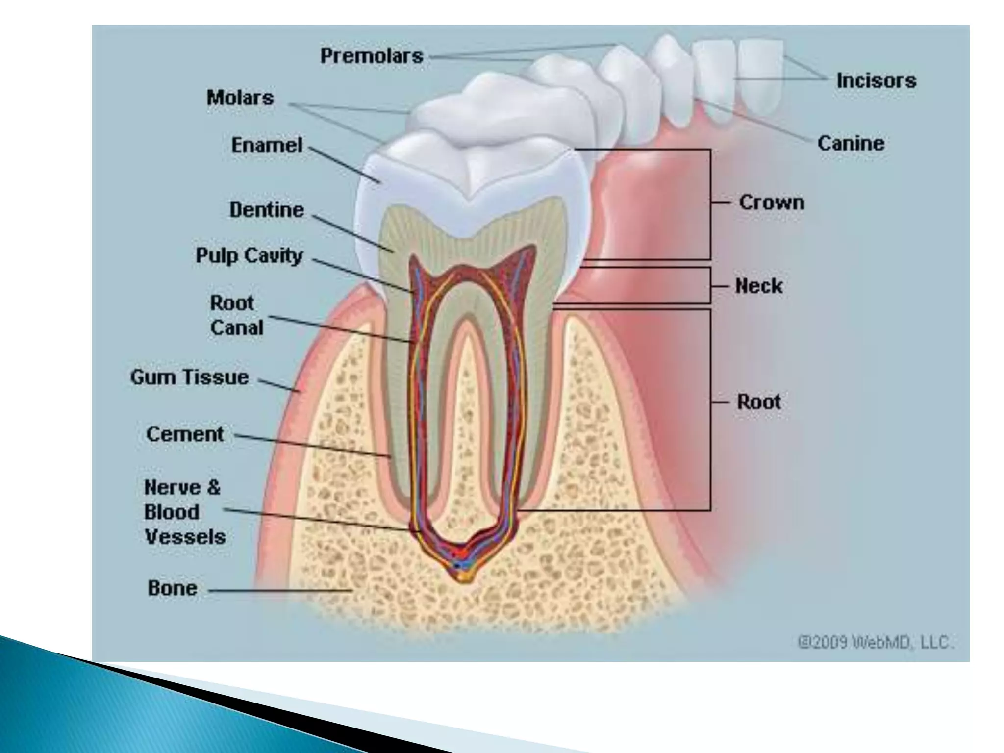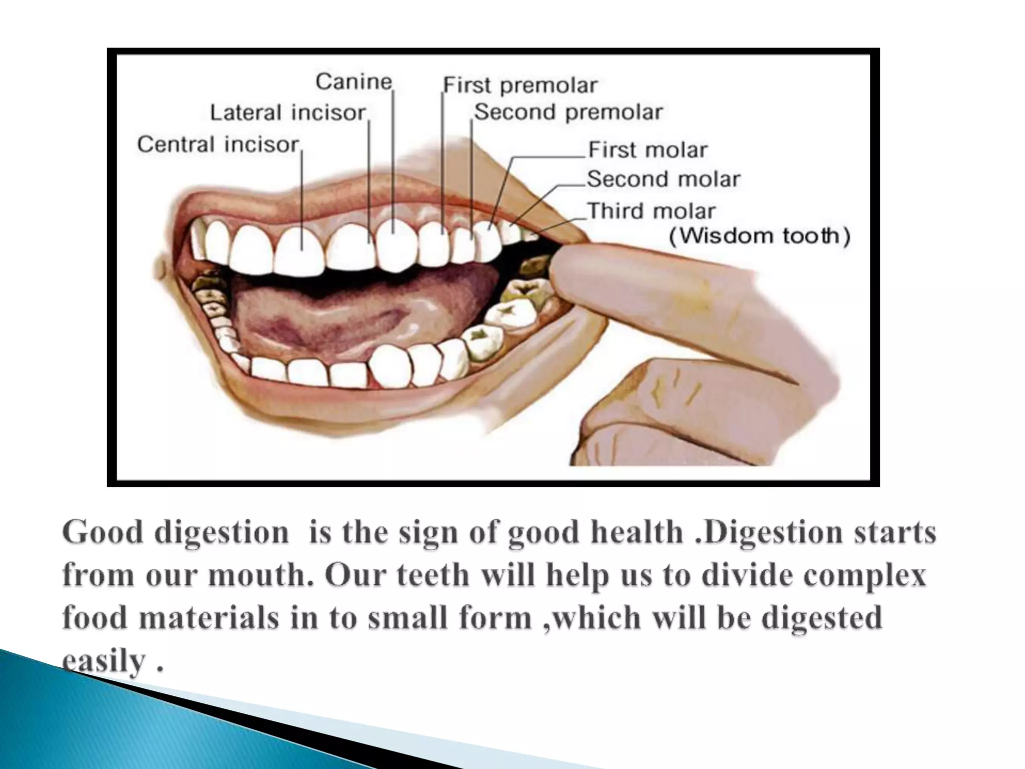 Human beings have 32 teeth, one tongue, and three pairs of salivary glands in the mouth. Each tooth is fixed in the lower jaw's cavities. The first teeth formed after birth are called milk teeth. Among the 32 permanent teeth, four are called wisdom teeth that appear only in adulthood. The five main parts of a tooth are enamel, dentin, pulp, cementum, and the periodontal ligament.