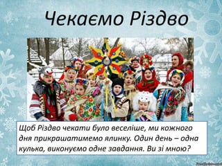 Тут розробленя цікаві різноманітні веселі завдання для кращого очікування свята Різдва Христового. Повеселіться усією сім'єю: танці, співи, веселі українські колядки, розмальовки чекають на вас та вашу родину. Підходитьдля використання вихователямии дитячого садочку. Для різновікової групи. Думаю, що ця презентація допоможе згуртуватися та краще пізнати один одного, діти та дорослі зможуть розкрити свої приховані здібності і таланти. Відроджуймо свої кращі традиції, пізнаваймо свої корені, вивчаймо їх.
