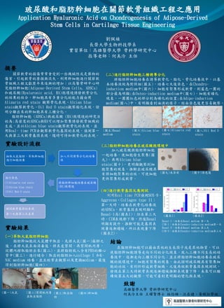 本研究探讨了玻尿酸和脂肪干细胞在关节软骨组织工程中的应用,发现玻尿酸微环境能增强脂肪干细胞的聚集和软骨化能力。实验结果表明,加入玻尿酸的培养液能够促进细胞的软骨分化,并通过实时PCR检测到相关基因表达的变化。未来的研究将继续观察更长时间内的细胞表现和基因表达。