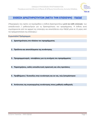 Πληροφορίες που πρέπει να περιλαμβάνει η έκθεση δραστηριοτήτων μετά την κάθε επίσκεψη των εκπαιδευτικών / μαθητών/τριών για τις δραστηριότητες του προγράμματος. Η έκθεση αυτή συμπληρώνεται από τον αρχηγό της επίσκεψης και αποστέλλεται στην ΠΔΕΔΕ μέσα σε 15 μέρες από την πραγματοποίηση της επίσκεψης.)