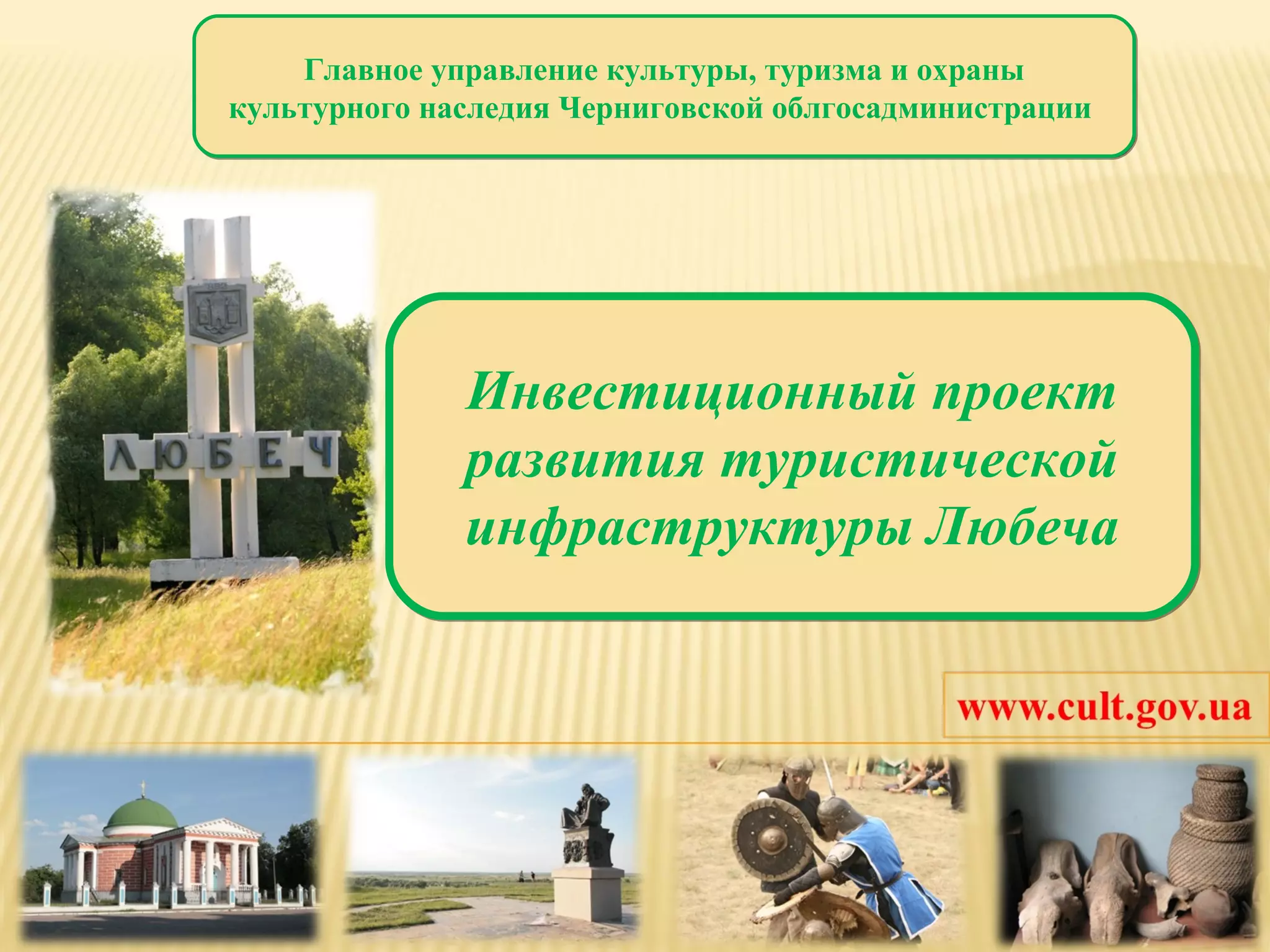 Документ описывает инвестиционный проект по развитию туристической инфраструктуры в историческом поселке Любеч, значимом для украинской культуры и истории. Проект включает создание историко-археологического комплекса, восстановление памятников и привлечение туристов через качественные улучшения и фестивали. Реализация этих мероприятий направлена на социально-экономическое развитие региона и увеличение туристических потоков.