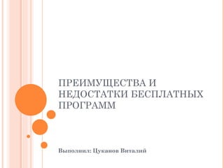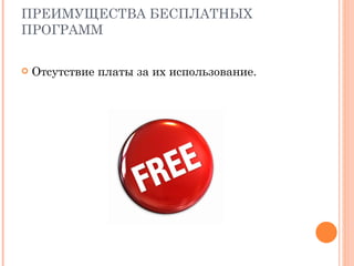 Документ рассматривает преимущества и недостатки бесплатных программ, выделяя отсутствие платы за использование, легальность и доступность исходных кодов как основные плюсы. В то же время отмечается риск отсутствия гарантий, недостаток технической поддержки и проблемы с пользовательским интерфейсом как значительные минусы. В заключение подчеркивается, что не все платные программы имеют доступные бесплатные аналоги.