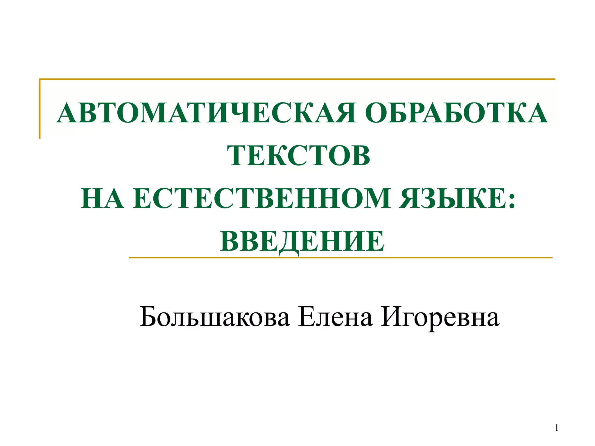 Документ представляет введение в автоматическую обработку текстов на естественном языке (АОН) и охватывает ее исторические аспекты, основные задачи, методы и ресурсы. Основное внимание уделяется лингвистическим и компьютерным подходам к обработке естественного языка, а также моделированию и трудностям, связанным с разнообразием языков. В заключение рассматриваются прикладные задачи, такие как машинный перевод и анализ текстов.