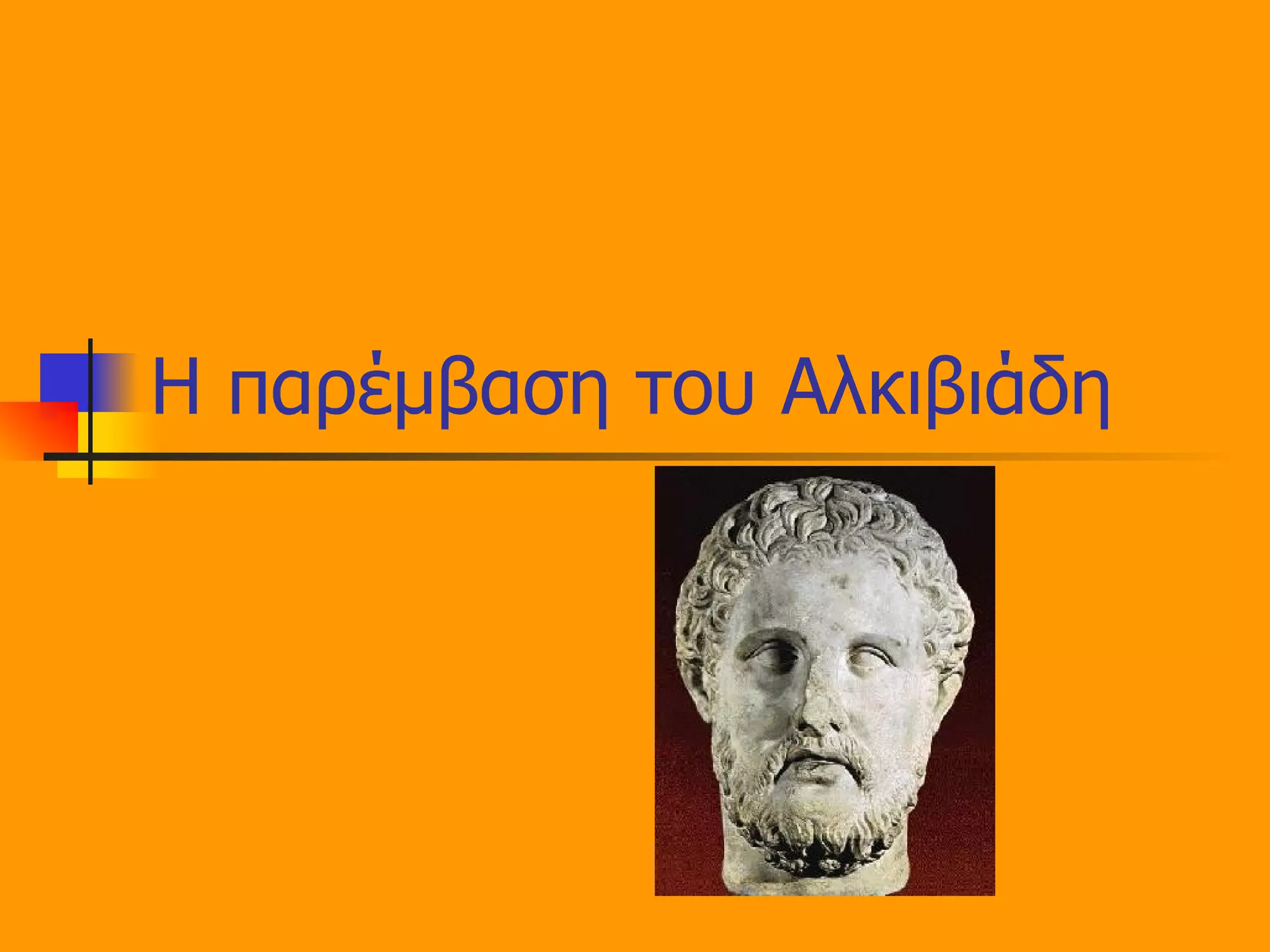 οι συμβουλές του αλκιβιάδη 1. 2. Ἀλκιβιάδης δὲ κατιδὼν ἐκ τῶν τειχῶν τοὺς μὲν Ἀθηναίους ἐν αἰγιαλῷ ὁρμοῦντας καὶ πρὸς οὐδεμιᾷ πόλει, τὰ δ’ ἐπιτήδεια ἐκ Σηστοῦ μετιόντας πεντεκαίδεκα σταδίους ἀπὸ τῶν νεῶν, τοὺς δὲ πολεμίους ἐν λιμένι καὶ πρὸς πόλει ἔχοντας πάντα, οὐκ ἐν καλῷ ἔφη αὐτοὺς ὁρμεῖν, ἀλλὰ μεθορμίσαι εἰς Σηστὸν παρῄνει πρός τε λιμένα καὶ πρὸς πόλιν· Κατιδών (μτχ) κατεῖδε<καθορῶ (παρατηρώ) αἰγιαλῷ (αἶγες + ἅλός) ακροθαλασσιά ὁρμοῦντας (μτχ.) του ὁρμῶ (αγκυροβολώ) Μετιόντας (μτχ) μέτειμι (μελλ. μετέρχομαι) μεταφέρω ἔφη<φημί =λέω, υποστηρίζω Μεθορμίσαι (μεθορμίζομαι) μετακινούμαι Παρῄνει< παραινῶ=συμβουλεύω Αντικ.παρήνει Αιτ. μτχ 3. ἔφη δὲ ΠΟΙΟΣ; Ἀλκιβιάδης ΤΙ; αὐτοὺς οὐκ ὁρμεῖν ἐν καλῷ ΓΙΑΤΙ; Κατιδὼν ἐκ τῶν τειχῶν τοὺς μὲν Ἀθηναίους ὁρμοῦντας ἐν αἰγιαλῷ καὶ πρὸς οὐδεμιᾷ πόλει, μετιόντας τὰ δ’ ἐπιτήδεια ἐκ Σηστοῦ πεντεκαίδεκα σταδίους ἀπὸ τῶν νεῶν, τοὺς δὲ πολεμίους ἔχοντας πάντα ἐν λιμένι καὶ πρὸς πόλει 4. 5. Ἀλκιβιάδης δὲ κατιδὼν ἐκ τῶν τειχῶν τοὺς μὲν Ἀθηναίους ἐν αἰγιαλῷ ὁρμοῦντας καὶ πρὸς οὐδεμιᾷ πόλει, τὰ δ’ ἐπιτήδεια ἐκ Σηστοῦ μετιόντας πεντεκαίδεκα σταδίους ἀπὸ τῶν νεῶν, τοὺς δὲ πολεμίους ἐν λιμένι καὶ πρὸς πόλει ἔχοντας πάντα, οὐκ ἐν καλῷ ἔφη αὐτοὺς ὁρμεῖν, ἀλλὰ μεθορμίσαι εἰς Σηστὸν παρῄνει πρός τε λιμένα καὶ πρὸς πόλιν· ΜΤΦ:Ο Αλκιβιάδης παρατηρώντας ψηλά από τα τείχη του ότι οι Αθηναίοι ήταν αγκυροβολημένοι σε ακτή χωρίς λιμάνι και μακριά από κάποια πόλη και ότι προμηθεύονταν τα τρόφιμα τους από την Σηστό που απείχε δέκα πέντε στάδια από τα πλοία, ενώ οι αντίπαλοί τους ήταν μέσα σε λιμάνι και κοντά σε πόλη και έτσι είχαν ό,τι χρειάζονταν, τους είπε ότι δεν είναι αραγμένοι σε καλό μέρος και τους συμβούλευε να μετασταθμεύσουν στην Σηστό όπου θα ήταν μέσα σε λιμάνι και κοντά σε πόλη · 6. οὗ ὄντες ναυμαχήσετε, ἔφη, ὅταν βούλησθε οὗ (επίρημμα) όπου ή παντού ὅταν <ὁτε +ἄν Βούλησθε<βούλομαι (θέλω) Απότομη μεταβολή του πλαγίου λόγου σε ευθύ 7. 8. οὗ ὄντες ναυμαχήσετε, ἔφη, ὅταν βούλησθε. ΜΤΦ:εκεί σταθμεύοντας, είπε, θα ναυμαχήσετε, όταν εσείς επιλέξετε. 9. Γιατί οι «Αιγός ποταμοί» δεν ήταν καλή τοποθεσία; Ήταν μακριά από τα κέντρα ανεφοδιασμού 10. οἱ δὲ στρατηγοί, μάλιστα δὲ Τυδεὺς καὶ Μένανδρος, ἀπιέναι αὐτὸν ἐκέλευσαν· αὐτοὶ γὰρ νῦν στρατηγεῖν, οὐκ ἐκεῖνον. καὶ ὁ μὲν ᾤχετο . Μάλιστα (υπερ.) μάλα ἀπιέναι (απαρ.) ἄπειμι ᾤχετο<οἵχομαι (αναχωρώ) αντικείμενο 11. 12. 13. 14. Οἱ δὲ στρατηγοί, μάλιστα δὲ Τυδεὺς καὶ Μένανδρος, ἀπιέναι αὐτὸν ἐκέλευσαν· αὐτοὶ γὰρ νῦν στρατηγεῖν, οὐκ ἐκεῖνον. Καὶ ὁ μὲν ᾤχετο. ΜΤΦ: Οι στρατηγοί όμως, και κυρίως ο Τυδέας και ο Μένανδρος, τον διέταξαν να φύγει· γιατί τώρα αυτοί είναι στρατηγοί και όχι εκείνος. Και ο Αλκιβιάδης αποχώρησε αμέσως . 15. Πώς κρίνετε την απάντηση των Αθηναίων στρατηγών Εγωιστική αλλά και… δικαιολογημένη Μετόπη Παρθενώνα