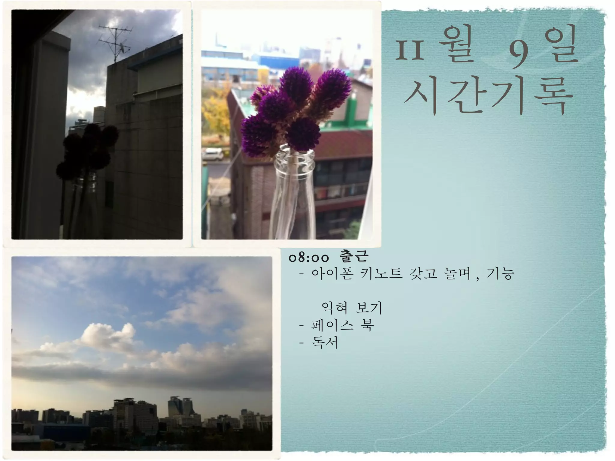 11 월 9 일 시간기록 08:00 출근 - 아이폰 키노트 갖고 놀며 , 기능 익혀 보기 - 페이스 북 - 독서 - 2.