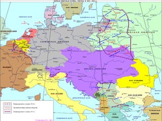 Документ описывает причины и ключевые события Первой мировой войны, включая конфликт между Тройственным союзом и Антантой. Он освещает важные сражения, такие как Битва на Марне и Битва при Ковеле, а также последствия войны, включая создание новых государств в Европе. В результате конфликта погибло более 10 миллионов человек, и карта Европы была значительно изменена.